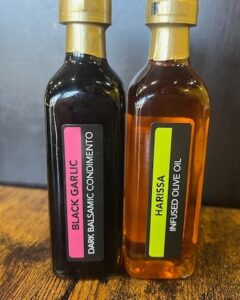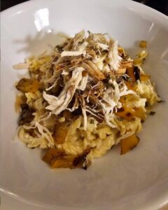 - Add cream in pan on low heat and add parmesan and garlic and seasonings and 2 tablespoons harissa oil. Mix into pasta, after pasta is cooked and drained. Top your creamy pasta with sautéed onion and peppers and shredded chicken and drizzle some black garlic balsamic.