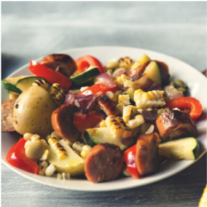 - Place the vegetables (potatoes, onion, peppers, zucchini, corn) on the grill along with the sausage. Grill the vegetables for 4 to 5 minutes, turning once, until charred but still a bit firm in texture. Remove from the grill, and place on a cutting board to cool slightly. Continue cooking the sausage until the internal temperature is 175°F