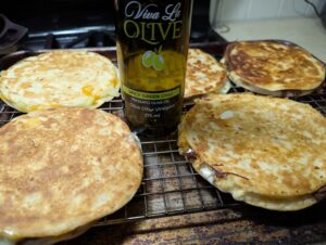 - Heat cast iron, spray tortillas with olive oil, add beef and cheese, cook until crisp!