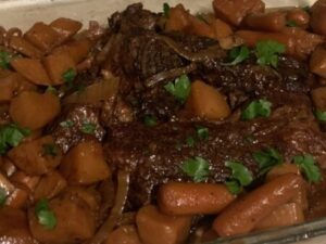- Transfer the beef back to the pot. Toss carrots and potatoes around the beef in the pot. Cover and cook in the oven at 350F degrees for 4 to 5 hours. When done, garnish with fresh parsley or cilantro and serve.